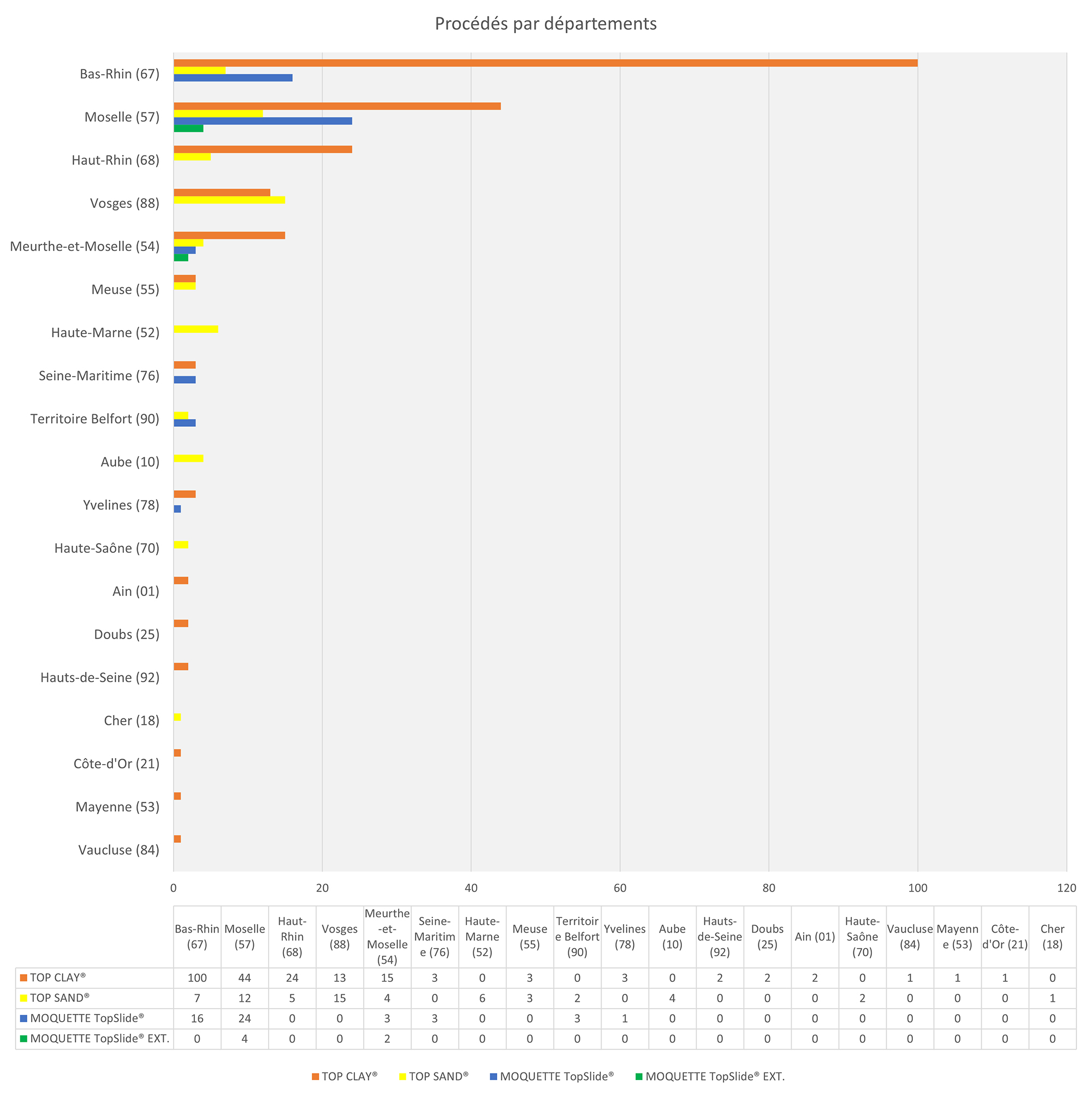 Une présentation cartographique et par départements pour trois produits phares parmi nos procédés : la terre artificielle Top Clay®, le procédé Top Sand® et les moquettes TopSlide®.